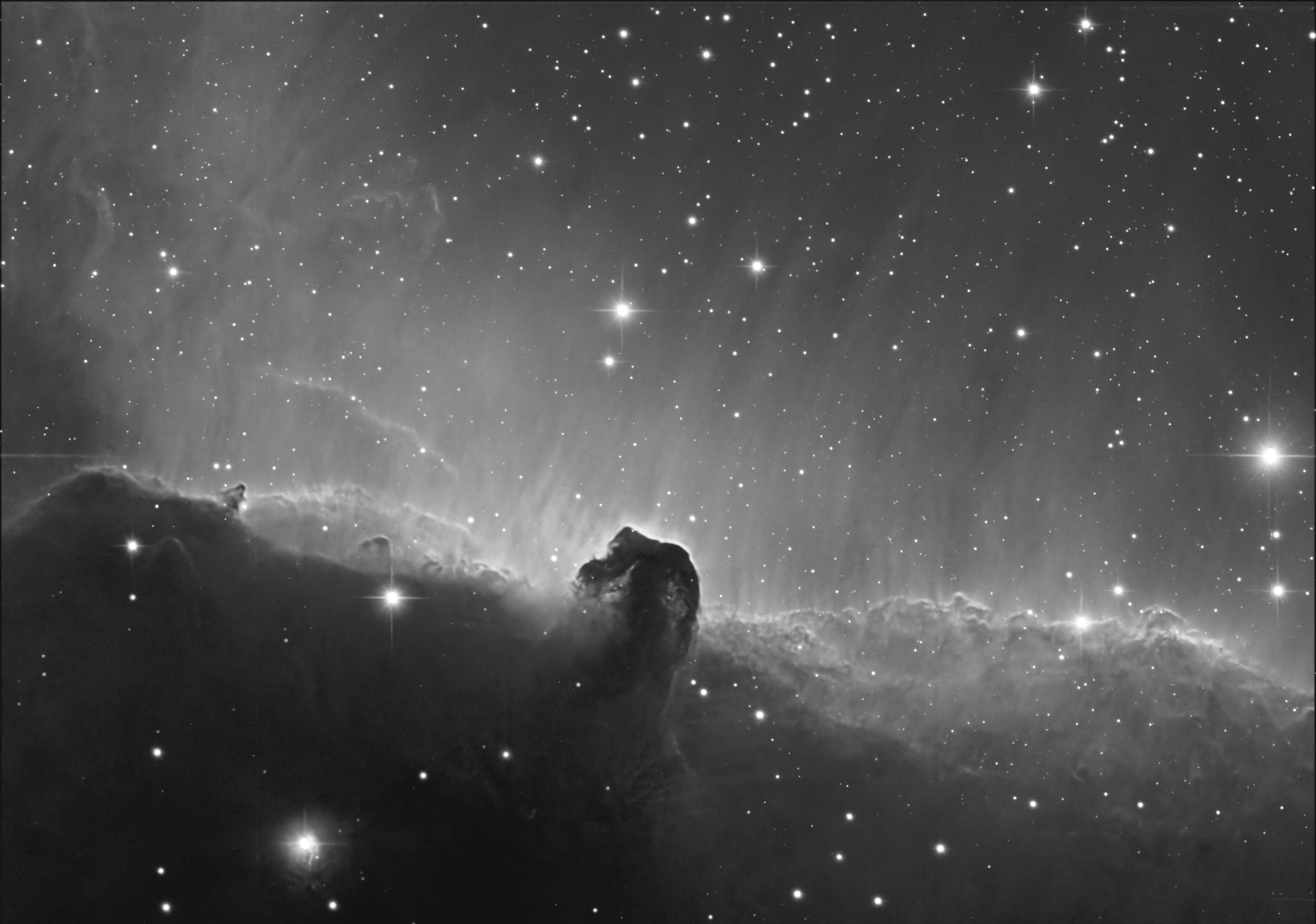 nebula (B33) in Hydrogen Alpha. The dark horsehead appears within a dense